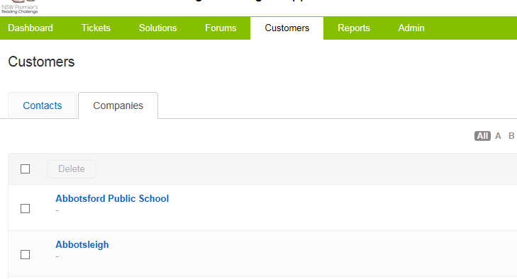 The Customers > Companies school data allows you to search for a school name or school code in Freshdesk to easily find the corresponding school code or school name.