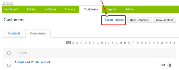 From here you can browse all the schools in Freshdesk. You can Export the data, or Import new schools using the buttons in the top right. You would do this when you have a large number of updates to make. If you Import school information where the name is the same as an existing name, the other details for this school will be updated based on the import data (a duplicate will not be created).