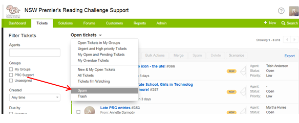 - click on the text above the table of tickets that describes what sort of tickets are currently being displayed