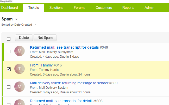 All the tickets listed will be categorised as Spam. You can choose to either Delete or mark them as Not Spam using the buttons at the top of the screen. These buttons will become active once you have ticked the checkbox alongside one or more tickets.
