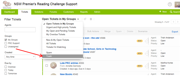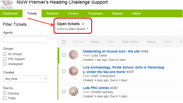 - click on the text above the table of tickets that describes what sort of tickets are currently being displayed