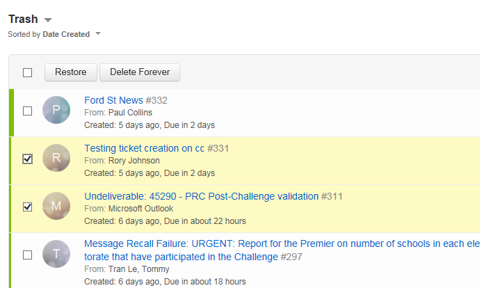 All of the tickets that have been deleted will appear in this list. You are able to Restore or Delete Forever using the buttons at the top of the screen. These buttons will become active when you tick one or more checkboxes beside a ticket in the list.