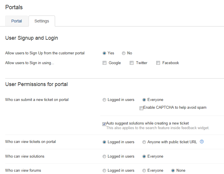 There is a second tab on this page named Settings. Within this page you can configure the behaviour and user permissions of the Knowledge base and Support site.